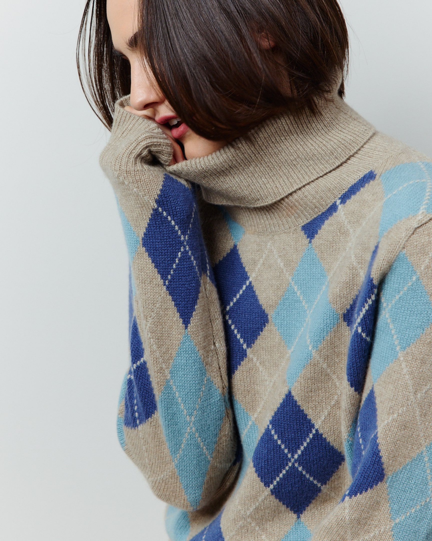 Die Farben des Meeres bilden verschiedene Blau- und Türkis-Schattierungen, gern in trendigen Argyle-Patterns, immer als hochwertige Intarsie gestrickt.